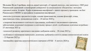 Мельник Неля Сергіївна, вчитель вищої категорії, «Старший вчитель», яка закінчила у 2005 році Рівненський державний гуманітарний університет за спеціальністю «Педагогіка і методика середньої освіти. Історія». Курси підвищення кваліфікації з даного предмету проходила на базі Рівненського ОІППО за програмою підвищення кваліфікації: -вчителів суспільних предметів історія, основи правознавства, основи філософії, етика, християнська етика, громадянська освіта – 24 квітня 2020 р.-створення інклюзивного освітнього середовища, особливості інклюзивного навчання, забезпечення додаткової підтримки в освітньому процесі дітей з особливими освітніми потребами – 25 листопада 2021 р.-технології розвитку критичного мислення здобувачів освіти – 20 січня 2022 р.-особливості оцінювання навчальних досягнень здобувачів освіти в умовах компетентнісної освіти – 23 березня 2023 р.-інноваційна практика компетентнісного навчання в НУШ – 8 лютого 2024 р.