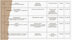 № з/п Заходи по проведенню моніторингу Методи проведення моніторингу Інструментарій Форма Строки 1 Стан ведення календарно – тематичних та поурочних планів Вивчення документації Аналіз стану ведення календарно – тематичних та поурочних планів Довідка До 30.11 2 Формування ключових компетентностей учнів на уроках історії в 5-11класах Відвідування уроків Спостереження за навчальними заняттями Довідка До 26.02 3 Аналіз результатів навчання учнів 5-11 класів з історії Діагностична контрольна робота з історії, відповідно до календарного планування Різнорівневі тестові завдання закритої та відкритої форми Довідка До 12.01 4 Рівень навченості учнів 5-11 класів за результатами І семестру з історії Вивчення документації Аналіз статистичних даних Довідка До 12.01