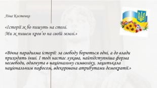 Ліна Костенко«Історії ж бо пишуть на столі. Ми ж пишем кров’ю на своїй землі.»«Вічна парадигма історії: за свободу борються одні, а до влади приходять інші. І тоді настає лукава, найпідступніша форма несвободи, одягнута в національну символіку, зацитькала національним пафосом, вдекорована атрибутами демократії.»