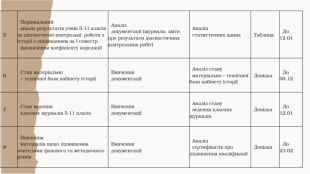 5 Порівняльний аналіз результатів учнів 5-11 класів за діагностичні контрольні роботи з історії з оцінюванням за І семестр (визначення коефіцієнту кореляції Аналіз документації (журнали, звіти про результати діагностичних контрольних робіт) Аналіз статистичних даних Таблиця До 12.01 6 Стан матеріально – технічної бази кабінету історії Вивчення документації Аналіз стану матеріально – технічної бази кабінету історії Довідка До 08.12 7 Стан ведення класних журналів 5-11 класів Вивчення документації Аналіз стану ведення класних журналів Довідка До 12.01 8 Вивчення матеріалів щодо підвищення вчителями фахового та методичного рівнів Вивчення документації Аналіз сертифікатів про підвищення кваліфікації Довідка До 23.02