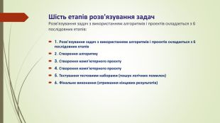 Розв’язання задач за допомогою алгоритмів та проєктної діяльності є важливою складовою сучасної інформатичної освіти. Учні навчаються аналізувати проблему, планувати послідовність дій, створювати алгоритми та реалізовувати їх у вигляді готових проєктів чи програмних рішень. Цей процес формує логічне мислення, вміння працювати з інформацією та застосовувати цифрові інструменти в реальних ситуаціях.