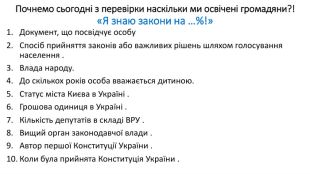 Почнемо сьогодні з перевірки наскільки ми освічені громадяни?!«Я знаю закони на …%!»Документ, що посвідчує особу Спосіб прийняття законів або важливих рішень шляхом голосування населення . Влада народу. До скількох років особа вважається дитиною. Статус міста Києва в Україні . Грошова одиниця в Україні . Кількість депутатів в складі ВРУ . Вищий орган законодавчої влади . Автор першої Конституції України . Коли була прийнята Конституція України .