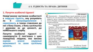 Права дитини. Так само, як гідність і внутрішню свободу, кожна людина з народження має права. Вони належать кожному / кожній, незалежно від того, чи усвідомлює людина це, і є рівними для всіх. Хай ми не здатні відразу після народження скористатися всіма своїми правами, але вони в кожного з нас безумовно є. Права людини — це визнані світовим співтовариством блага й умови життя, можливості людини, необхідні для її нормального розвитку. Діти мають такі самі права, що й дорослі, адже дитина — це людина в період дитинства, тобто до 18 років.
