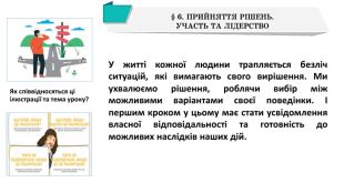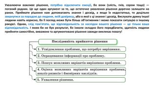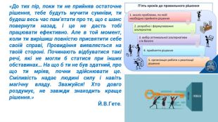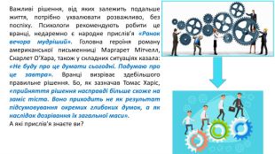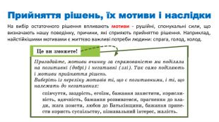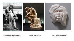 Урок побудовано на прикладах з життя, тому використовано матеріал слайдів для роботи учнів у мікрогрупах: мотиви, рішення-вчинки, наслідки. Для розвитку критичного мислення надані ілюстрації з міжпредметних галузей: живопис і скульптура.