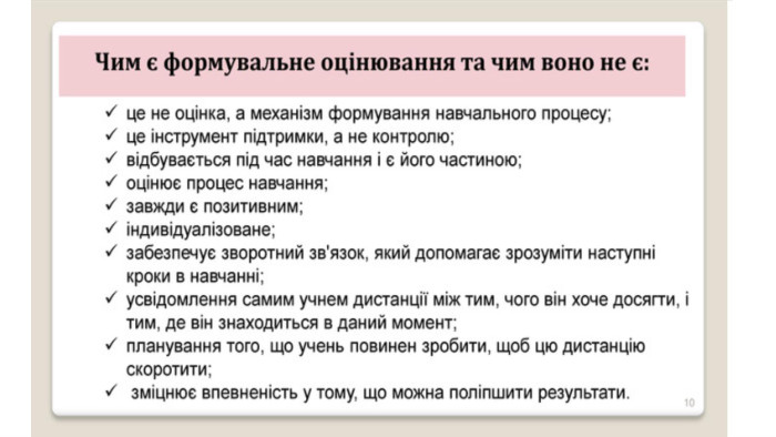 Формувальне оцінювання — це безперервний, інтерактивний процес оцінювання «для навчання», що здійснюється в процесі навчання. Його головна мета — не виставити бал, а мотивувати учнів, підтримати їхній прогрес, вчасно виявити прогалини та адаптувати методи викладання. Воно включає зворотний зв'язок, самооцінювання та взаємооцінювання, що допомагає вдосконалити навчання. Техніки та прийоми формувального оцінювання