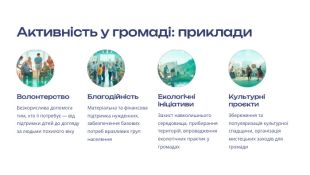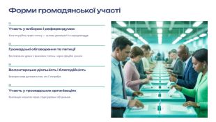 Презентація на тему "Громадянська участь в житті людей" 10 клас. В презентації представлена інформація про громадянське суспільство, форми громадянської участі, громадянську активність, соціальну активність громадян, активність у громаді, екологічна активність тощо.