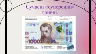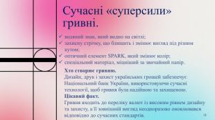 Сучасні «суперсили» гривні.13водяний знак, який видно на світлі;захисну стрічку, що блищить і змінює вигляд під різним кутом;оптичний елемент SPARK, який змінює колір;спеціальний матеріал, міцніший за звичайний папір. Хто створює гривню. Дизайн, друк і захист українських грошей забезпечує Національний банк України, використовуючи сучасні технології, щоб гривня була надійною та захищеною. Цікавий факт. Гривня входить до переліку валют із високим рівнем дизайну та захисту, а її зовнішній вигляд неодноразово оновлювався відповідно до сучасних стандартів.