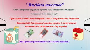 "Вигідна покупка" 14 Сім'я Петренків вирішила купити сік у коробках на тиждень. У магазині є дві пропозиції: Пропозиція А: Одна велика коробка соку (2 літри) коштує 70 гривень. Пропозиція Б: Дві маленькі коробки соку (по 1 літру кожна) коштують по 38 гривень за одну коробку. Яка пропозиція вигідніша і на скільки гривень?