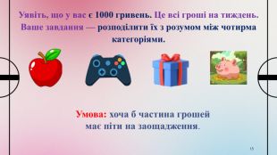 15 Уявіть, що у вас є 1000 гривень. Це всі гроші на тиждень. Ваше завдання — розподілити їх з розумом між чотирма категоріями. Умова: хоча б частина грошей має піти на заощадження.