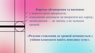 16 Коротке обговорення та висновок у кожного різні пріоритети;планування допомагає не витратити все одразу;заощадження — це звичка, а не залишок грошей.«Розумне ставлення до грошей починається з уміння планувати навіть невелику суму».
