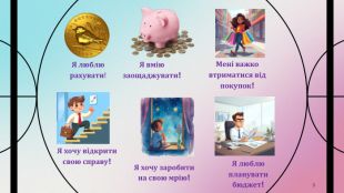 3 Я люблю рахувати!Я вмію заощаджувати!Мені важко втриматися від покупок!Я хочу відкрити свою справу!Я хочу заробити на свою мрію!Я люблю планувати бюджет!