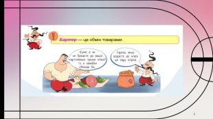 Що таке гроші?4 Гроші — це засіб обміну. Колись люди мінялися речами: рибою, сіллю, камінцями…Уяви, що тобі дали 3 курки за урок математики — це називається бартер!