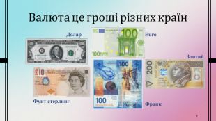 Валюта це гроші різних країн9 Долар. Euro. Злотий. Фунт стерлинг. Франк