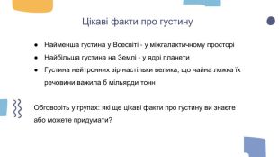 Цікаві факти про густину. Найменша густина у Всесвіті - у міжгалактичному просторіНайбільша густина на Землі - у ядрі планети. Густина нейтронних зір настільки велика, що чайна ложка їх речовини важила б мільярди тонн. Обговоріть у групах: які ще цікаві факти про густину ви знаєте або можете придумати?