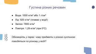 Густина різних речовин. Вода: 1000 кг/м³ або 1 г/см³Лід: 920 кг/м³ (плаває у воді!)Залізо: 7800 кг/м³Повітря: 1,29 кг/м³ (при 0°C)Обговоріть у парах: чому предмети з різною густиною поводяться по-різному у воді?