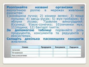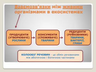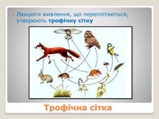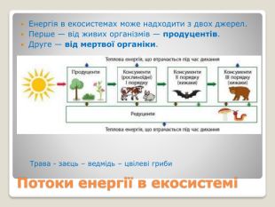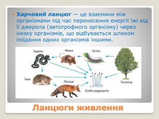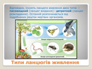 Харчові зв'язки в екосистемах: прямі і непрямі; антагоністичні, нейтральні та мутуалістичні; продуценти, консументи, редуценти. Ланцюги живлення. Типи ланцюгів живлення: пасовищний та детритний. Трофічна сітка. Потоки енергії в екосистемах. Екологічна піраміда, її сутність.