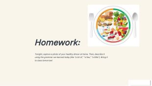 Homework: Tonight, capture a photo of your healthy dinner at home. Then, describe it using the grammar we learned today (like "a lot of," "a few," "a little"). Bring it to class tomorrow!