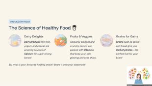 VOCABULARY FOCUSThe Science of Healthy Food 🥛Dairy Delights. Dairy products like milk, yogurt, and cheese are amazing sources of Calcium for super strong bones!Fruits & Veggies. Colourful oranges and crunchy carrots are packed with Vitamins that keep your skin glowing and eyes sharp. Grains for Gains. Grains such as cereal and bread give you Carbohydrates—the perfect fuel for your brain!So, what is your favourite healthy snack? Share it with your classmate!
