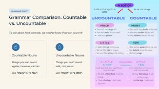 GRAMMAR BOOSTGrammar Comparison: Countable vs. Uncountable To talk about food correctly, we need to know if we can count it!Countable Nouns. Things you can count: apples, bananas, carrots. Use "many" or "a few". Uncountable Nouns. Things you can't count: milk, rice, water. Use "much" or "a little".