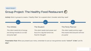 GROUP PROJECTGroup Project: The Healthy Food Restaurant 🥙Activity: Work in groups to create a "Healthy Plate" for a special client. Consider what they need!1 The Athlete. This client needs lots of energy and strong muscles to run fast and jump high!2 The Student. This client needs brain power and focus for a big test tomorrow. Food for thought!3 The Party Planner. This client needs yummy, sugar-free snacks that everyone will love at a party!Presentation Rule: When you present your menu, remember to use our new grammar words: "a lot of", "a few", and "a little"!