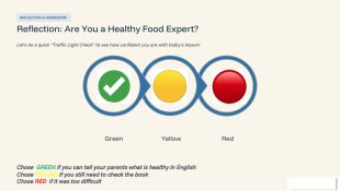 REFLECTION & HOMEWORKReflection: Are You a Healthy Food Expert? Let's do a quick "Traffic Light Check" to see how confident you are with today's lesson!Red. Yellow. Green. Chose GREEN if you can tell your parents what is healthy in English. Chose YELLOW if you still need to check the book. Chose RED if it was too difficult