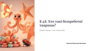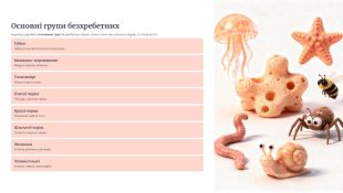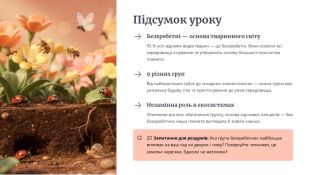 Підсумок уроку. Безхребетні — основа тваринного світу95 % усіх відомих видів тварин — це безхребетні. Вони освоїли всі середовища існування та утворюють основу більшості екосистем планети.9 різних груп. Від найпростіших губок до складних членистоногих — кожна група має унікальну будову тіла та пристосування до умов середовища. Незамінна роль в екосистемах. Опилення рослин, збагачення ґрунту, основа харчових ланцюгів — без безхребетних наша планета виглядала б зовсім інакше.💬 Запитання для роздумів: Яка група безхребетних найбільше впливає на ваш сад чи дворик і чому? Поміркуйте: можливо, це земляні черв'яки, бджоли чи метелики?