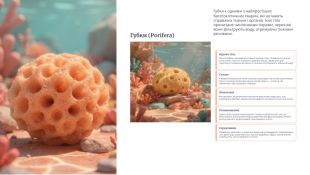 Губки (Porifera)Губки є одними з найпростіших багатоклітинних тварин, які не мають справжніх тканин і органів. Їхнє тіло пронизане численними порами, через які вони фільтрують воду, отримуючи поживні речовини. Будова тіла. Мішкоподібне, пронизане системою каналів і пор. Складається з різних типів клітин, таких як хоаноцити (для фільтрації), амебоцити (для транспорту поживних речовин) та пінакоцити (утворюють зовнішній шар). Скелет. Утворений мікроскопічними голками (спікулами) з вапна або кремнезему, або ж гнучкими волокнами органічної речовини — спонгіну. Це забезпечує губці підтримку та форму. Живлення. Фільтратори: за допомогою хоаноцитів прокачують воду крізь тіло, затримуючи бактерії, мікроскопічні водорості та органічні частинки як їжу. Розмноження. Здатні як до статевого (випускаючи сперму та яйцеклітини), так і до безстатевого розмноження (брунькуванням або фрагментацією). Мають високу здатність до регенерації пошкоджених частин. Середовище. Переважно мешкають у морських водах, від мілководдя до глибоководних зон. Деякі види зустрічаються у прісних водоймах. Ведуть прикріплений спосіб життя, часто утворюючи колонії.