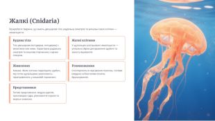 Жалкі (Cnidaria)Безхребетні тварини, що мають двошарове тіло, радіальну симетрію та унікальні жалкі клітини — нематоцисти. Будова тіла. Тіло двошарове (ектодерма, ентодерма) з мезоглеєю між ними. Характерна радіальна симетрія та кишкова порожнина з одним отвором. Жалкі клітини. У щупальцях розташовані нематоцисти — унікальна зброя для враження здобичі та захисту від ворогів. Живлення. Хижаки. Жалкі клітини паралізують здобич, яку потім щупальцями захоплюють і перетравлюють у кишковій порожнині. Розмноження. Спостерігається чергування поколінь: статеве (медузи) та безстатеве (поліпи, брунькування). Представники. Типові представники: медуза аурелія, прісноводна гідра, різноманітні корали та морські анемони.