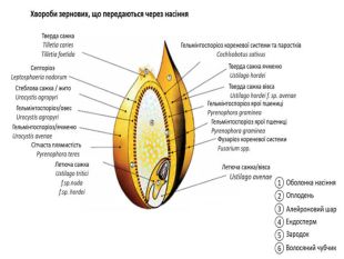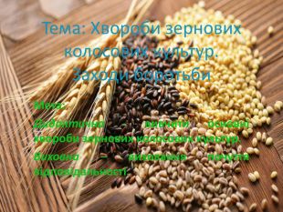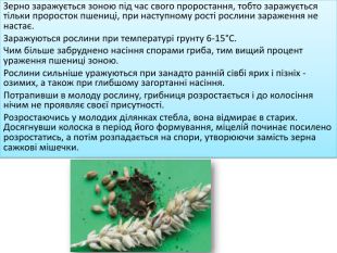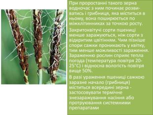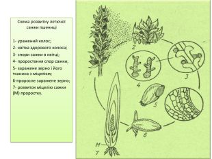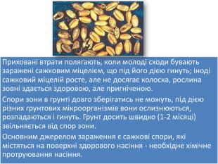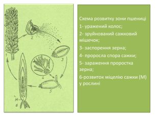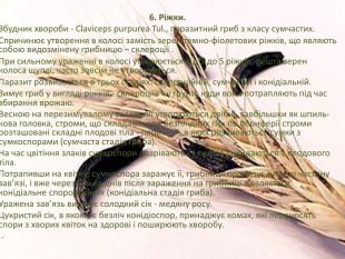 6. Ріжки. Збудник хвороби - Claviceps purpurea Tul., паразитний гриб з класу сумчастих. Спричинює утворення в колосі замість зерен темно-фіолетових ріжків, що являють собою видозмінену грибницю – склероції . При сильному ураженні в колосі утворюється від 3 до 5 ріжків, решта зерен колоса щуплі, часто зовсім не утворюються. Паразит розвивається в трьох стадіях: склероційній, сумчастій і конідіальній. Зимує гриб у вигляді ріжків - склероціїв - у грунті, куди вони потрапляють під час збирання врожаю. Весною на перезимувалому склеропії утворюються дрібні, завбільшки як шпилькова головка, строми, що складаються з безплідних гіф, по периферії строми розташовані складні плодові тіла - перитеції, в яких розвиваються сумки з сумкоспорами (сумчаста стадія гриба). На час цвітіння злаків сумкоспори дозрівають і з силою викидаються з плодового тіла. Потрапивши на квітку, сумкоспора заражує її, грибниця пронизує нижню частину зав’язі, і вже через кілька днів після зараження на грибниці з’являється конідіальне спороносіння (конідіальна стадія гриба). Уражена зав’язь виділяє солодкий сік - медяну росу. Цукристий сік, в якому є безліч конідіоспор, принаджує комах, які переносять спори з хворих квіток на здорові і поширюють хворобу.