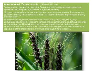 Сажка пшениці. Збудник хвороби - Ustilago tritici Jens. Захворювання поширене повсюди. Сажка пшениці за характером зараження і проявом хвороби різко відрізняється від зони пшениці. Збудник сажки руйнує всі частини колоска, за винятком стрижня. Тому колоски, уражені сажкою, легко помітити в полі - всі частини колоска перетворені в чорну спорову масу. Хламідоспори збудника сажки значно менші, ніж у зони, округлі, з дещо шипуватою оболонкою. З хворого колоска спори потрапляють за допомогою вітру на здорові квітки. На приймочці квітки вони проростають в грибницю, яка проникає в зав’язь і заражує її. Із зараженої зав’язі формується зовні нормальне зерно, в якому в стані спокою міститься грибниця збудника сажки.