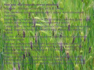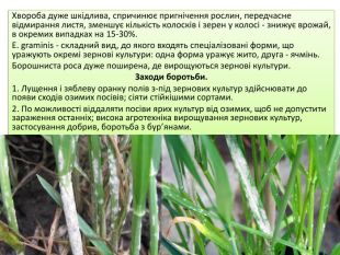 5. Смугаста плямистість ячменю Збудник – Drechslera graminea Ito. Зустрічається повсюди, більш шкідлива на Поліссі та в Лісостепу. Смугаста плямистість призводить до відмирання листків, утворення щуплих зерен. Урожай зерна за умов епіфітотійного розвитку може знижуватися в 4,5 рази. Уражує листки, піхви, стебла і колосся спочатку у вигляді жовтих плям, які пізніше зливаються у світло-коричневі смуги з вузькою пурпуровою облямівкою. На плямах і смугах утворюється темно-сірий наліт конідіального спороношення. Максимальний розвиток хвороби спостерігається у фазі цвітіння-наливання зерна. У місцях ураження листки підсихають, руйнуються, розщеплюються уздовж на кілька частин, засихають і обпадають. При ураженні колоса міцелій проникає в зав’язь, спричиняє внутрішнє зараження зерна без зовнішніх ознак, але в окремих сортів цей тип ураження викликає побуріння зародка і всієї зернівки. У нестійких сортів спостерігається дифузне поширення міцелію. Рослинні рештки та уражене насіння – джерело інфекції. Після перезимівлі в рослинних рештках гриб може утворювати перитеції з сумками та сумкоспорами, які є додатковим джерелом інфекції. У цій стадії збудник смугастої плямистості називають Pyrenophora graminea. Міцелій, що знаходиться в зерні ячменю, після висіву проростає разом із зерном. Сприятливими є прохолодна і волога погода. Проростання міцелію разом із зародком приводить до зараження всього проростка. Після інфікування піхви зародкового корінця гриб поширюється всередині всієї молодої рослини. Рослина уражується хворобою в тій або іншій мірі, залежно від стійкості до хвороби сортів ячменю. Заходи захисту. Використання здорового посівного матеріал; вирощування стійких сортів; стимулювання появи швидких сходів; протравлення насіння (Венцедор).