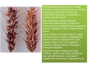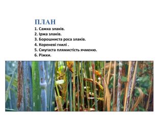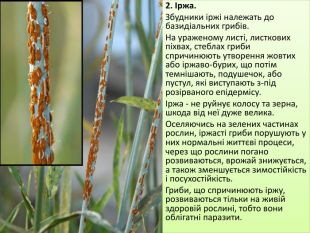 2. Іржа. Збудники іржі належать до базидіальних грибів. На ураженому листі, листкових піхвах, стеблах гриби спричинюють утворення жовтих або іржаво-бурих, що потім темнішають, подушечок, або пустул, які виступають з-під розірваного епідермісу.Іржа - не руйнує колосу та зерна, шкода від неї дуже велика. Оселяючись на зелених частинах рослин, іржасті гриби порушують у них нормальні життєві процеси, через що рослини погано розвиваються, врожай знижується, а також зменшується зимостійкість і посухостійкість. Гриби, що спричинюють іржу, розвиваються тільки на живій здоровій рослині, тобто вони облігатні паразити.