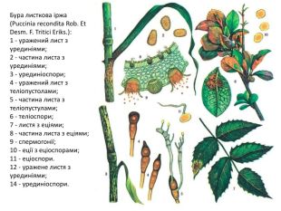 Бура листкова іржа (Puccinia recondita Rob. Et Desm. F. Tritici Eriks.):1 - уражений лист з урединіями; 2 - частина листа з урединіями; 3 - урединіоспори; 4 - уражений лист з теліопустолами; 5 - частина листа з теліопустулами; 6 - теліоспори; 7 - листя з еціями; 8 - частина листа з еціями; 9 - спермогонії; 10 - еції з еціоспорами; 11 - еціоспори.12 - уражене листя з урединіями; 14 - урединіоспори.