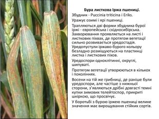 Бура листкова Іржа пшениці. Збудник - Puccinia triticina і Eriks. Уражує озимі і ярі пшениці. Трапляються дві форми збудника бурої іржі - європейська і східносибірська. Захворювання проявляється на листі і листкових піхвах, де протягом вегетації сильно розвивається уредостадія. Уредопустули іржаво-бурого кольору безладно розміщуються на пластинці листка і листкових піхов. Уредоспори одноклітинні, округлі, шипуваті. Протягом вегетації утворюються в кількох і поколіннях. Восени на тій же грибниці, де раніше були уредоспори, але частіше з нижньої сторони, з’являються дрібні довгасті темні купки зимових телейтоспор, прикриті шкіркою, що просвічує. У боротьбі з бурою іржею пшениці велике значення має вирощування стійких сортів.