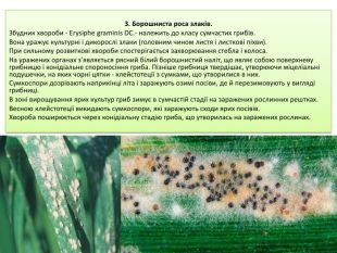 3. Борошниста роса злаків. Збудник хвороби - Erysiphe graminis DC.- належить до класу сумчастих грибів. Вона уражує культурні і дикорослі злаки (головним чином листя і листкові піхви). При сильному розвиткові хвороби спостерігається захворювання стебла і колоса. На уражених органах з’являється рясний білий борошнистий наліт, що являє собою поверхневу грибницю і конідіальне спороносіння гриба. Пізніше грибниця твердішає, утворюючи міцеліальні подушечки, на яких чорні цятки - клейстотеції з сумками, що утворилися в них. Сумкоспори дозрівають наприкінці літа і заражують озимі посіви, де й перезимовують у вигляді грибниці. В зоні вирощування ярих культур гриб зимує в сумчастій стадії на заражених рослинних рештках. Весною клейстотеції викидають сумкоспори, які заражують сходи ярих посівів. Хвороба поширюється через конідіальну стадію гриба, що утворилась на заражених рослинах.