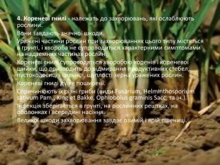 4. Кореневі гнилі - належать до захворювань, які ослаблюють рослини. Вони завдають значної шкоди. Уражені частини рослин при захворюваннях цього типу містяться в грунті, і хвороба не супроводиться характерними симптомами на надземних частинах рослин. Кореневі гнилі супроводяться хворобою коренів і кореневої шийки, що призводить до відмирання продуктивних стебел, пустоколосиці і сильної, щуплості зерна уражених рослин. Кореневі гнилі дуже поширені. Спричинюють їх різні гриби (види Fusarium, Helminthosporium sativum Pam., King et Bakke, Ophiobolus graminis Sacc. та ін.).Інфекція зберігається в грунті, на рослинних рештках, на оболонках і всередині насіння. Великої шкоди захворювання завдає озимій і ярій пшениці.