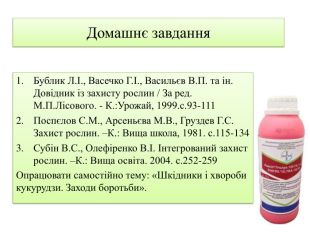 Домашнє завдання. Бублик Л.І., Васечко Г.І., Васильєв В. П. та ін. Довідник із захисту рослин / За ред. М. П. Лісового. - К.: Урожай, 1999.с.93-111 Поспєлов С. М., Арсеньєва М. В., Груздев Г. С. Захист рослин. –К.: Вища школа, 1981. с.115-134 Субін В. С., Олефіренко В.І. Інтегрований захист рослин. –К.: Вища освіта. 2004. с.252-259 Опрацювати самостійно тему: «Шкідники і хвороби кукурудзи. Заходи боротьби».