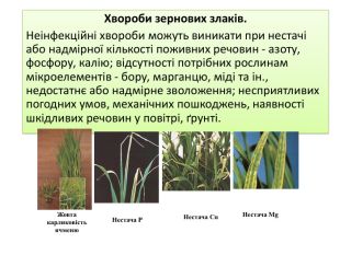 Хвороби зернових злаків. Неінфекційні хвороби можуть виникати при нестачі або надмірної кількості поживних речовин - азоту, фосфору, калію; відсутності потрібних рослинам мікроелементів - бору, марганцю, міді та ін., недостатнє або надмірне зволоження; несприятливих погодних умов, механічних пошкоджень, наявності шкідливих речовин у повітрі, ґрунті. Нестача PЖовта карликовість ячменю. Нестача Mg. Нестача Сu