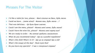 Phrases For The Visitor. I’d like a table for two, please. – Мені столик на двох, будь ласка. Could we have... (some wine)? – Можна нам, будь ласка ...? That was delicious. – Це було дуже смачно. Could I see the menu, please? – Можна мені меню, будь ласка? Could I have the wine list, please? – Можна мені карту вин? We are ready to order. – Ми готові зробити замовлення. What do you recommend today? – Що ви сьогодні порадите? What's this dish? What's in it? – Що це за страва? Що в ній? What's the (soup) of the day? – Який (суп) дня? Do you have any specials? – У вас є спеціальні страви?