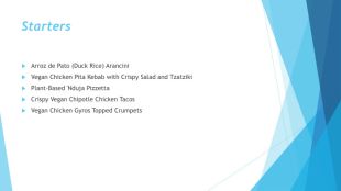Starters. Arroz de Pato (Duck Rice) Arancini. Vegan Chicken Pita Kebab with Crispy Salad and Tzatziki. Plant-Based 'Nduja Pizzetta. Crispy Vegan Chipotle Chicken Tacos. Vegan Chicken Gyros Topped Crumpets