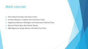 Main courses. Plant-Based Choripán with Salsa Criolla. Chicken Milanese a Caballo with Chimichurri Rojo. Vegetarian Beetroot Wellington with Mushroom & Merlot Gravy. Mexican Pozole Rojo (Red Posole) Recipe. BBQ Vegetarian Burger Recipe with Meat-Free Patty
