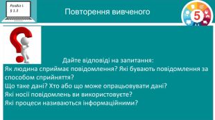 Повторення вивченого5 Розділ І.§ 1.3 Дайте відповіді на запитання: Як людина сприймає повідомлення? Які бувають повідомлення за способом сприйняття?Що таке дані? Хто або що може опрацьовувати дані?Які носії повідомлень ви використовуєте?Які процеси називаються інформаційними?