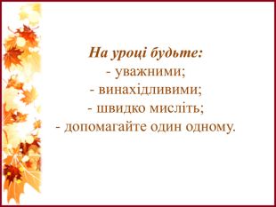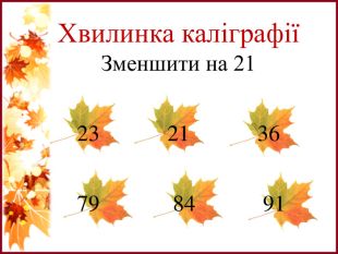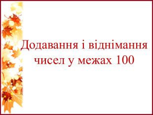 Розробка презентації до уроку на заявлену тему, мета якого закріпити знання здобувачів освіти про вивчені способи додавання і віднімання, порівняння чисел, складання і розв'язування задач за коротким записом. Узагальнення і систематизація знань учнів за темою «Осінні явища». Завдання пропонуються в ігровій формі.