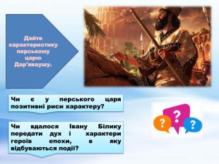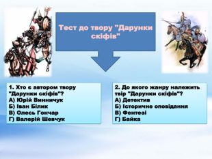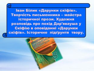 Презентація «Іван Білик «Дарунки скіфів». Творчість письменника – майстра історичної прози. Художня розповідь про похід Дар'явауша у Скіфію в оповіданні «Дарунки скіфів». Історичне підґрунтя твору» створена до підручника української літератури 8 класу НУШ О.Авраменка. Робота містить запитання на повторення, теоретичні відомості, ілюстративний матеріал, запитання на розуміння тексту та тестові завдання. Презентація допоможе вчителю у підготовці до уроку та може бути використана під час дистанційного навчання.