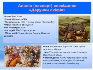 Автор: Іван Білик. Назва: Дарунки скіфів. Рік написання: 1989 (у складі збірки “Золотий Ра”)Жанр: історичне оповідання. Рід літератури: епос. Час подій: 514-513 роки до н.е. Місце подій: Територія між Дунаєм, Прутом і Дніпром. Тема: Зображення боротьби скіфів проти перського війська.Ідея: Утвердження сили та єдності народу в захисті своєї землі. Головна думка: Навіть потужна армія може зазнати поразки, якщо народ об'єднаний і готовий захищати свою Батьківщину. Аналіз (паспорт) оповідання «Дарунки скіфів»