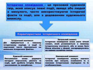 Історичне оповідання - це прозовий художній твір, який описує певні події, явища або людей з минулого, часто використовуючи історичні факти та події, але з додаванням художнього вимислу. Характеристики історичного оповіданняІсторичний контекст: Дія відбувається в певному історичному періоді, а події та персонажі часто ґрунтуються на реальних історичних фактах. Художній вимисел: Письменник може додавати вигадані персонажі, діалоги та події, щоб зробити історію більш захопливою та емоційною. Навчальний елемент:Історичні оповідання можуть навчати читачів про минуле, знайомити їх з певними історичними періодами та їх особливостями. Загальний сюжет:Історичне оповідання може мати чіткий сюжет, який розвивається в певному історичному контексті, або ж може бути більш вільним у формі, зосереджуючись на певних аспектах епохи.