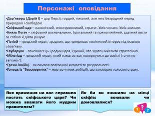 Персонажі оповідання. Дар’явауш (Дарій І) – цар Персії, гордий, пихатий, але геть безрадний перед природою і свободою. Скіфський цар – лаконічний, спостережливий, стратег. Уміє чекати. Уміє зникати. Князь Пугач – скіфський воєначальник, брутальний та прямолінійний, здатний вести за собою й діяти рішуче. Гістіей – грецький тиран, зрадник, що прикриває політичний інтерес під маскою обов’язку. Гаубарува – списоносець і родич царя, єдиний, хто здатен мислити стратегічно. Мільтіад – грецький тиран, який намагається повернутися до совісті (та чи не запізно?). Греки-іонійці – як символ політичної хиткості та роздвоєності. Гонець із “безсмертних” – жертва чужих амбіцій, що заговорив голосом страху. Яке враження на вас справила постать скіфського царя? Чи можна вважати його мудрим правителем?Як би ви вчинили на місці скіфів: воювали чи домовлялися?