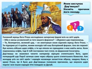 Головний жрець бога Птаха несподівано заперечив Цареві всіх на світі царів.– Хіба я менш уславлений за того вашого фараона? – обурився цар-переможець.– Ти, безперечно, великий цар, – не змигнувши оком відповів жрець бога Птаха. – Ти підкорив усі ті країни, якими володів той наш богорівний фараон. Але він переміг був колись військо царя скіфів, а ти ще ніколи не схрещував з ним навіть меча. Коли переможеш скіфів, тоді й тобі поставимо такі статуї, як фараонові Сесострісу. Дар'явауш не зважився чинити наперекір жрецям єгипетського бога, адже попередній цар Персії загинув саме через образу цього єгипетського божества. Але володар усіх на світі країн і народів назавжди запам'ятав образу, завдану йому в храмі Птаха. Це й було для Дар'явауша головною причиною, що змусила царя персів і всіх інших народів піти походом за Дунай. Яким виступає Дар'явауш? Назвіть причини його походу.