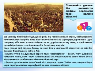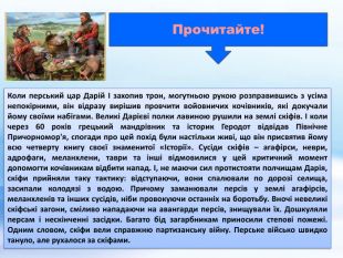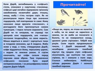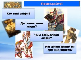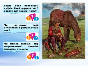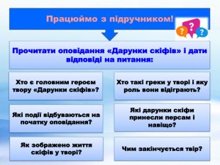 Працюймо з підручником!Прочитати оповідання «Дарунки скіфів» і дати відповіді на питання: Які події відбуваються на початку оповідання?Хто є головним героєм твору «Дарунки скіфів»?Хто такі греки у творі і яку роль вони відіграють?Які дарунки скіфи принесли персам і навіщо?Як зображено життя скіфів у творі?Чим закінчується твір?