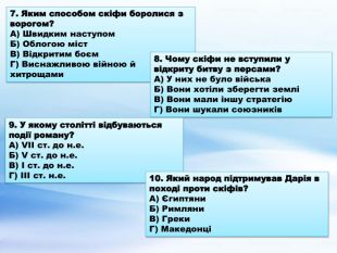 7. Яким способом скіфи боролися з ворогом?А) Швидким наступом. Б) Облогою міст. В) Відкритим боєм. Г) Виснажливою війною й хитрощами8. Чому скіфи не вступили у відкриту битву з персами?А) У них не було війська. Б) Вони хотіли зберегти земліВ) Вони мали іншу стратегію. Г) Вони шукали союзників9. У якому столітті відбуваються події роману?А) VII ст. до н.е. Б) V ст. до н.е. В) І ст. до н.е. Г) ІІІ ст. н.е.10. Який народ підтримував Дарія в поході проти скіфів?А) Єгиптяни. Б) Римляни. В) Греки. Г) Македонці
